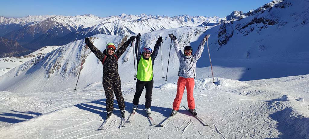 Группы были небольшими, но это позволило каждому уделить достаточно много времени. Первая мини-группа состояла из трех девушек, а вторая — из семейной пары. Занимались на склоне ежедневно и индивидуально с каждым по 2,5 часа. С теми, кто был на обучении у меня впервые, проходили базовый курс большого радиуса, а с теми, кто повторно, — базовый курс малого. Все ребята хорошо справились со всеми упражнениями и повысили свое горнолыжное мастерство.